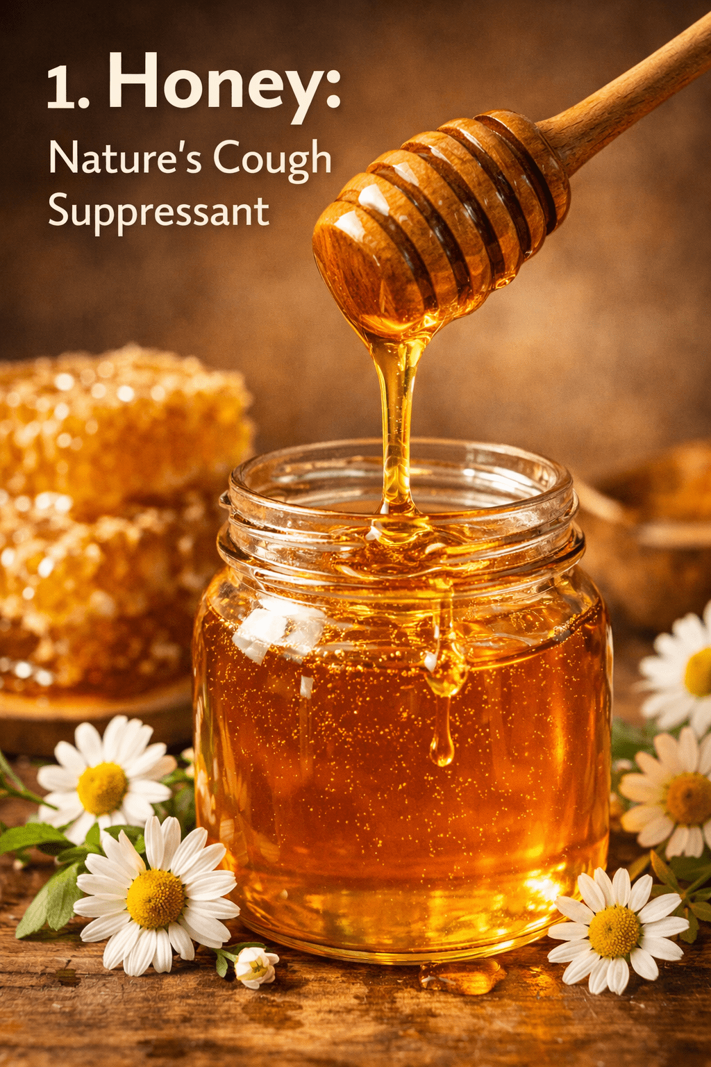 Honey stands out as the most researched and effective natural cough remedy available. Clinical studies show honey is superior to usual care in suppressing coughs from upper respiratory infections and reducing the need for antibiotics[2]. It performs comparably to dextromethorphan, the active ingredient in many commercial cough suppressants[2].