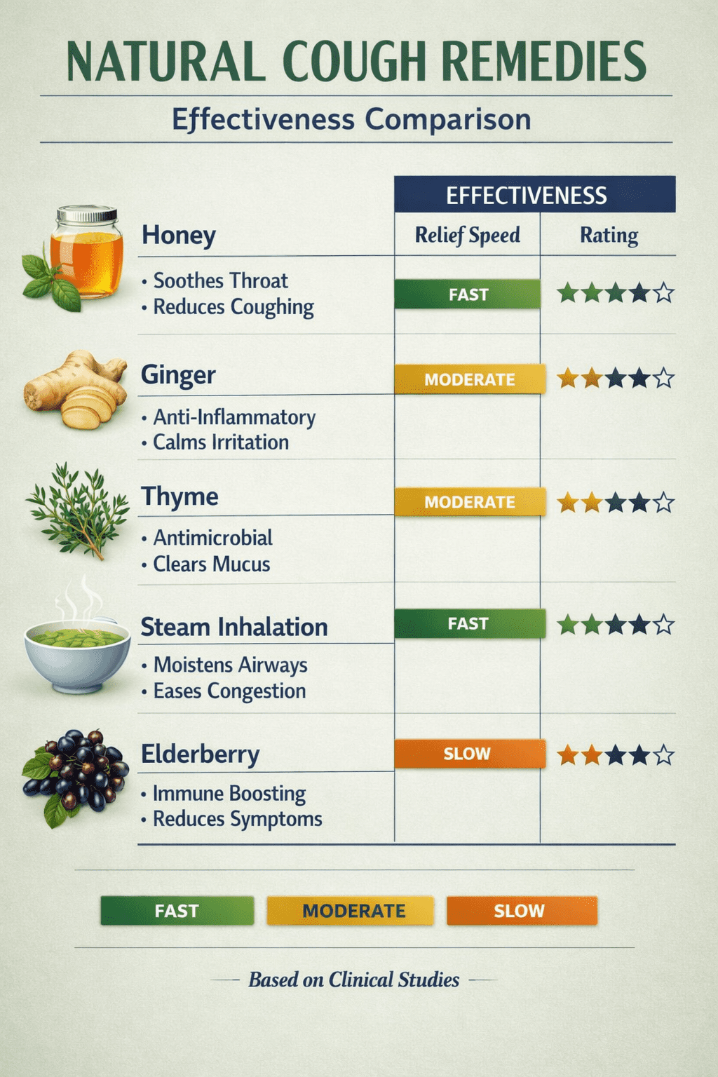 Natural remedies for cough offer effective, evidence-based alternatives or complements to conventional medications. Honey stands out with the strongest clinical evidence, performing as well as common cough suppressants while offering antimicrobial benefits[2]. Ginger, thyme-ivy combinations, steam therapy, and elderberry all show promising results in research studies[1][2].