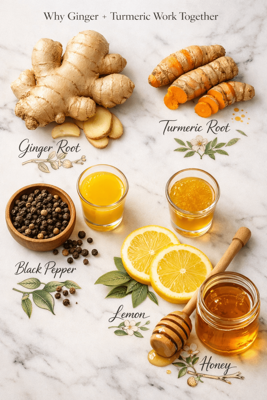 - Ginger and turmeric work synergistically — research suggests the combination is more effective at reducing inflammation than either ingredient alone [1]