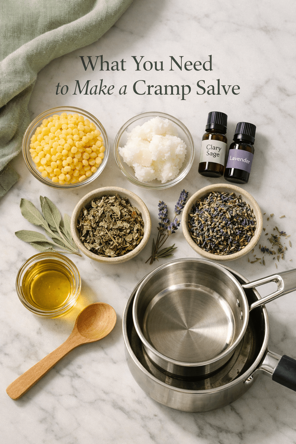 Every good cramp salve starts with three building blocks: a wax to give it body, a carrier oil to deliver the actives into your skin, and essential oils chosen for their muscle-relaxing or hormone-supportive properties.