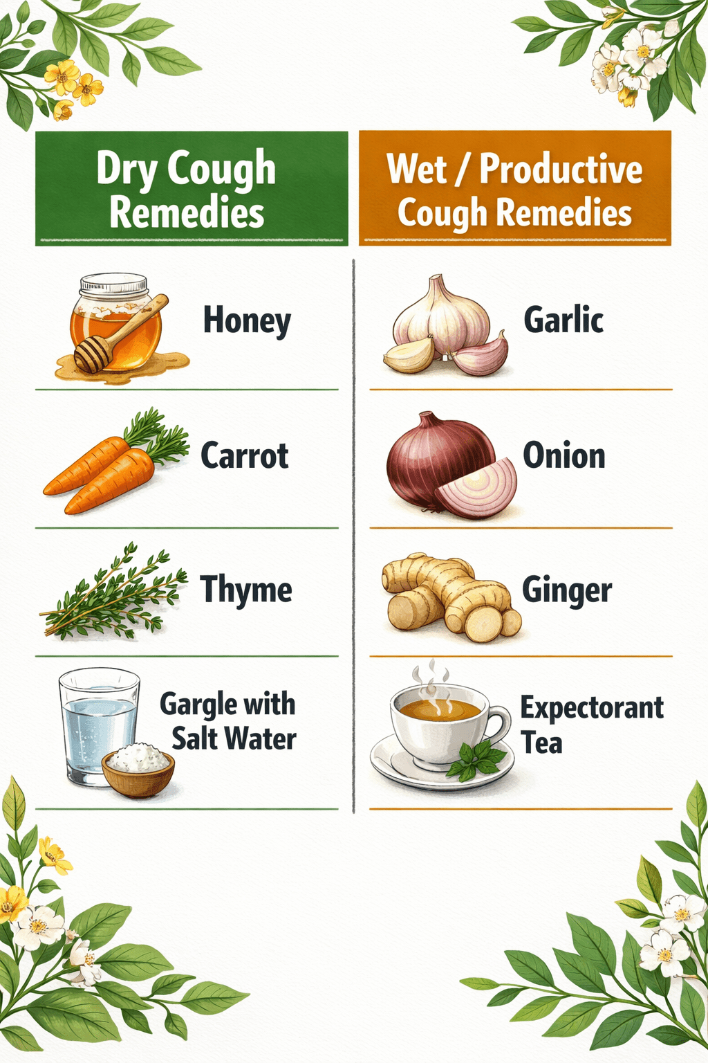A suppressant reduces the urge to cough (good for dry coughs). An expectorant loosens and thins mucus so it’s easier to cough up (good for wet coughs). Honey and oregano act more as suppressants; garlic, thyme, and ginger act more as expectorants [1][4].