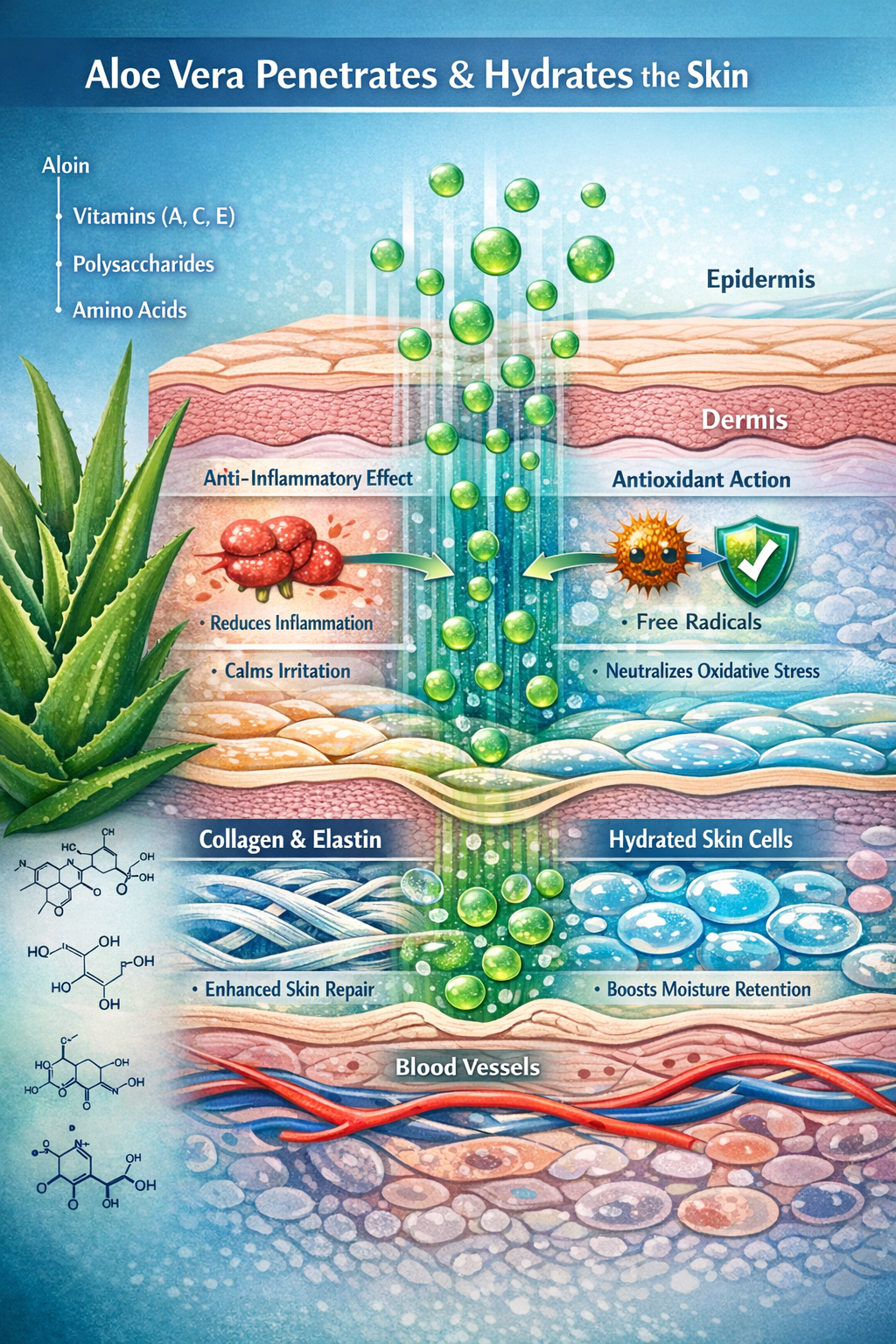 - Aloe vera contains 99% water plus vitamins A, C, E, and enzymes that reduce inflammation and protect against UV damage