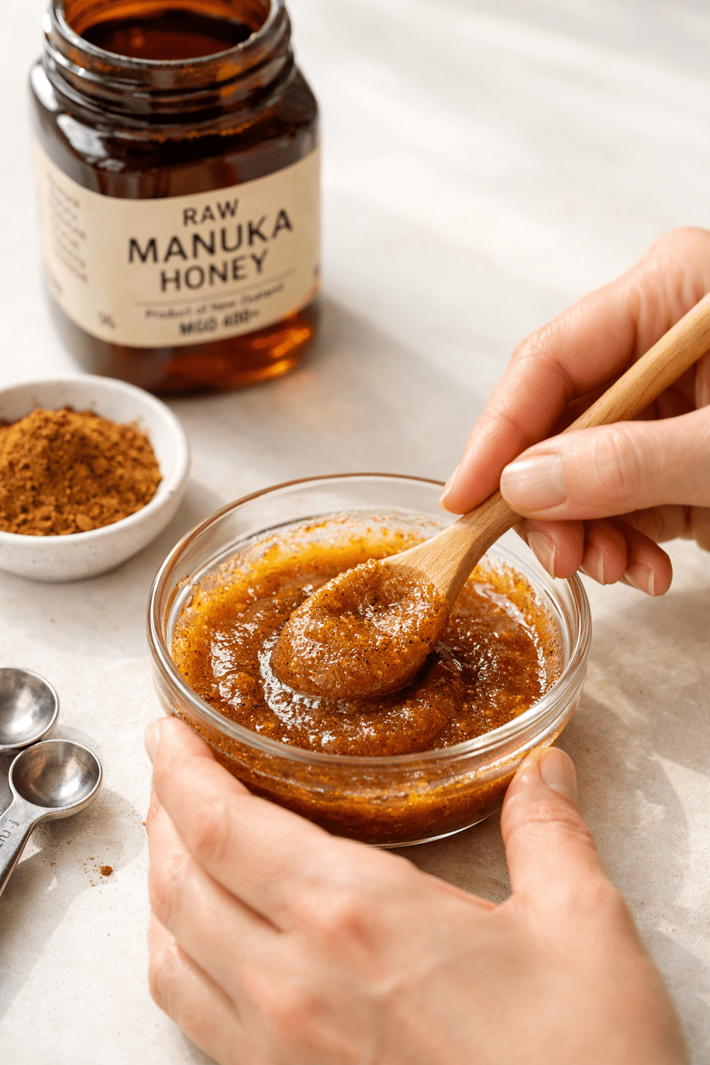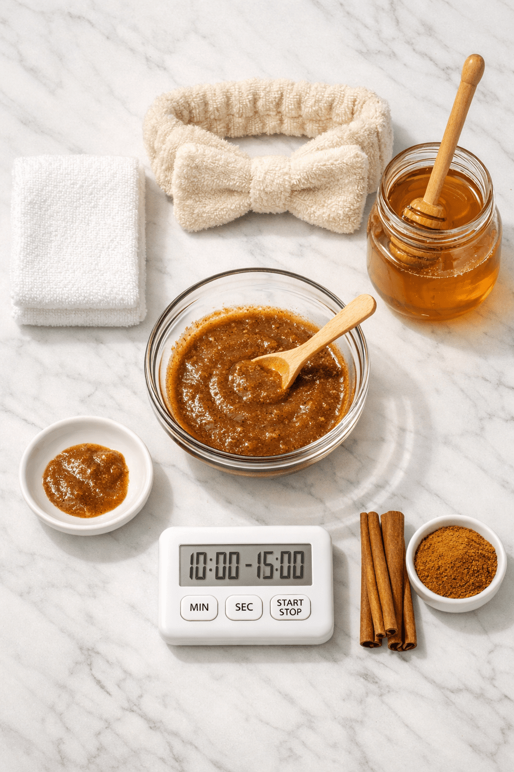 Creating this mask takes less than five minutes with ingredients you probably already have. The standard recipe uses a 2:1 ratio of honey to cinnamon, which balances effectiveness with safety for most skin types.[2][9]