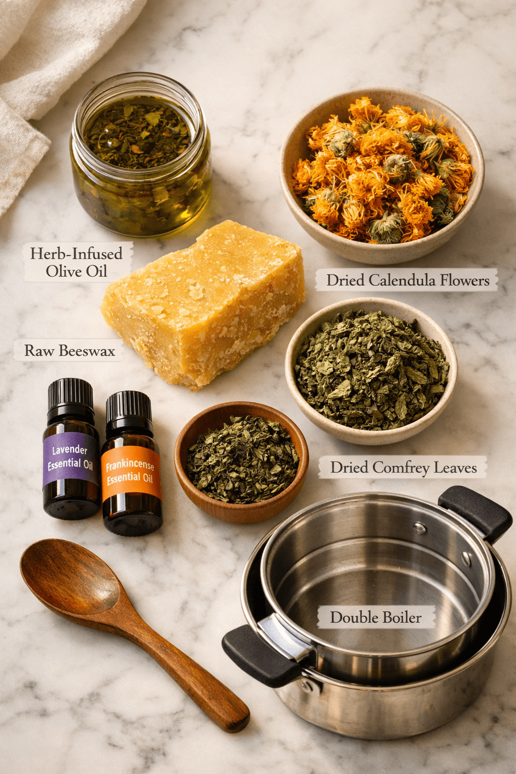 | Herb-infused oil (olive, coconut, or jojoba) | 1 cup | Carrier + herbal benefits |