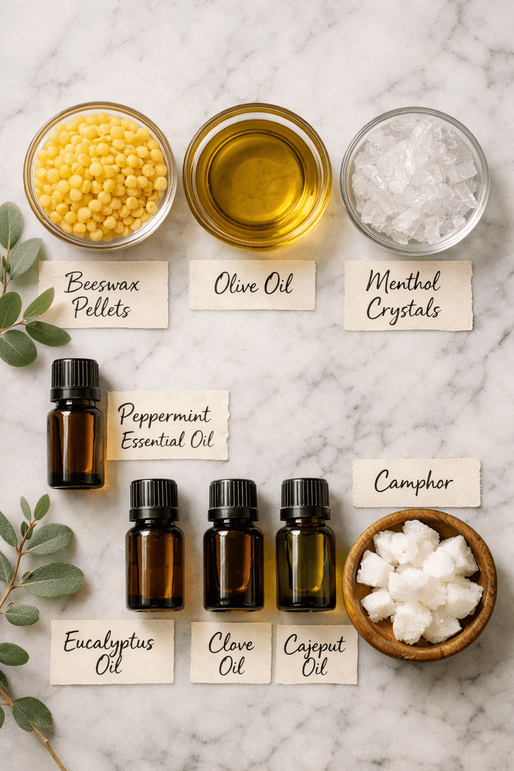 Here’s the core ingredient list for a standard white-style DIY Tiger Balm recipe. This makes approximately 2–4 small jars.