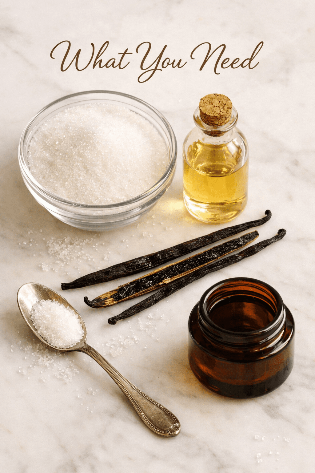 You need just three core ingredients: granulated sugar, a carrier oil, and vanilla. Everything else is optional but can boost the scrub’s performance or scent.