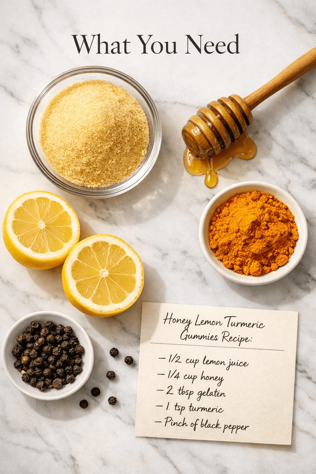 - Gather your 5 ingredients (gelatin, honey, lemon, turmeric, black pepper)