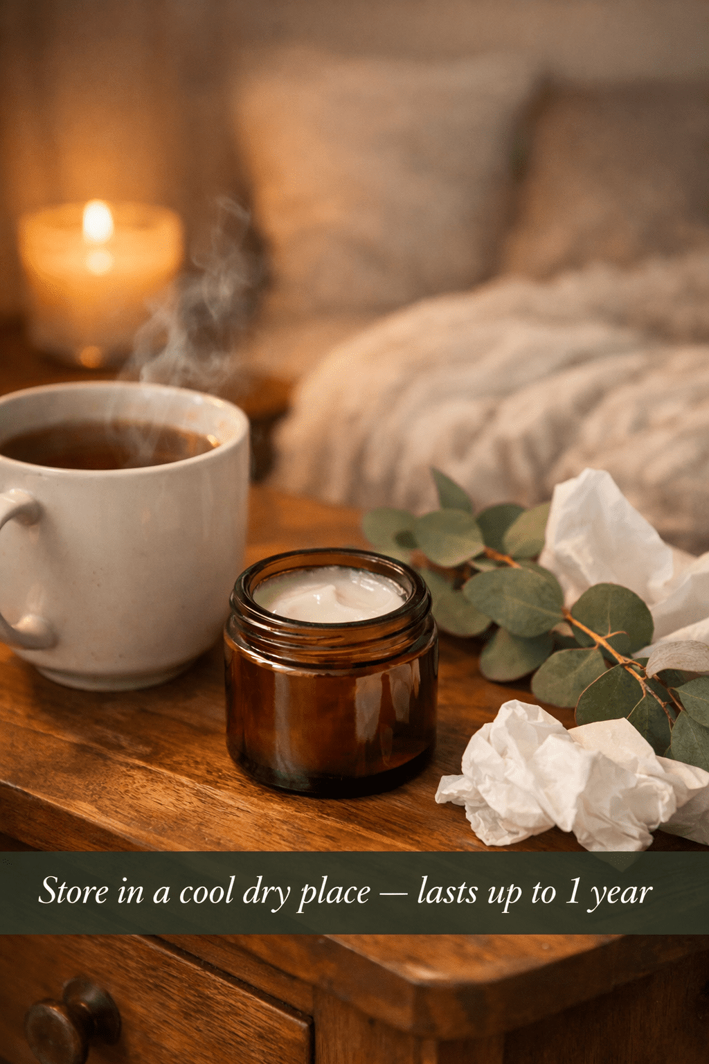 Store your homemade vapor rub in a small glass jar or 4-ounce metal tin in a cool, dry place — away from direct sunlight and heat. Stored properly, it lasts up to one year [2].
